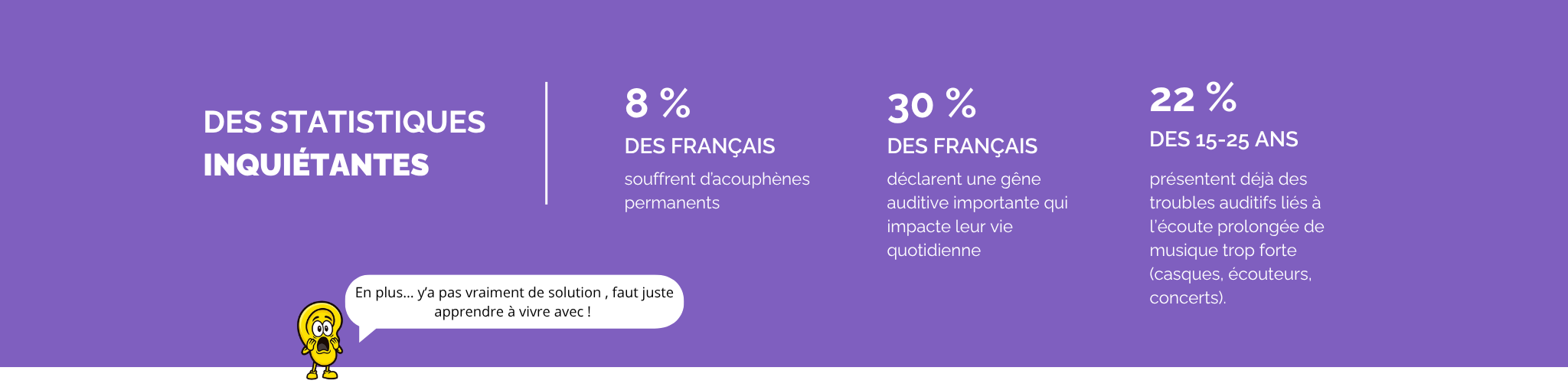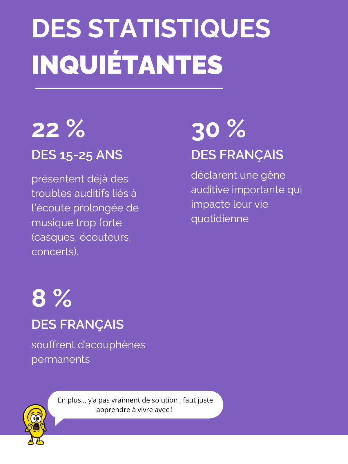 1 personne sur 3 souffre d'acouphènes ou de troubles auditifs à cause du bruit constant… c'est chiant, irritant, et ça change la vie.